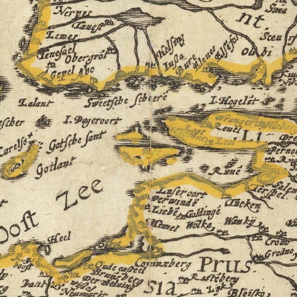 Gerard De Jode (1509-1591) was a pre-eminent mapmaker in the late seventeenth century, a time when the Dutch dominated the map trade. He was known for his many maps, some of which featured in Speculum Orbis Terrae (first edition Antwerp: 1578). Although never as successful as Ortelius’ Theatrum, the Speculum did get republished in a second edition in 1593, two years after De Jode’s death, by Arnold Coninx, and included this map. After his death, Gerard’s son, Cornelis (1568-1600), and his wife, Paschina, ran the shop. Unfortunately, Cornelis died young in 1600, aged only 32, and the stock and plates were sold to the publisher Joan Baptista Vrients.