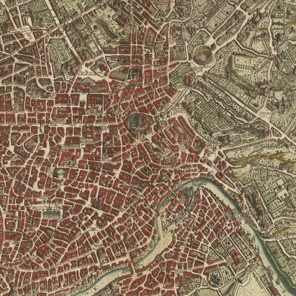 This fine map of Rome is based on Giovanni Battista Falda's influential wall map. It provides remarkable detail down to the streets, churches, houses, gardens, piazzas, bridges and gates with the Vatican appearing in the immediate foreground. The legends flanking the map contain a key to 464 locations.