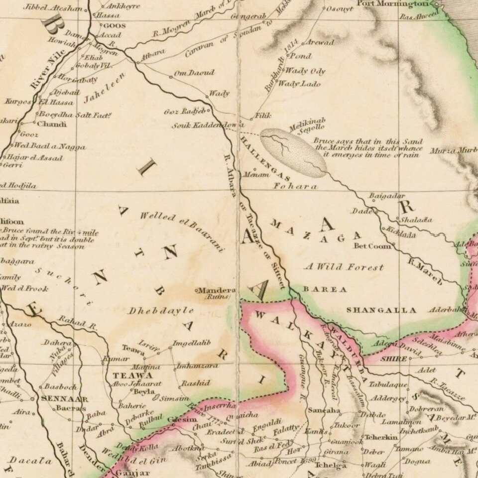 Decorative map of Nubia, Abyssinia and the Arabian Sea, published in London by Sidney Hall.