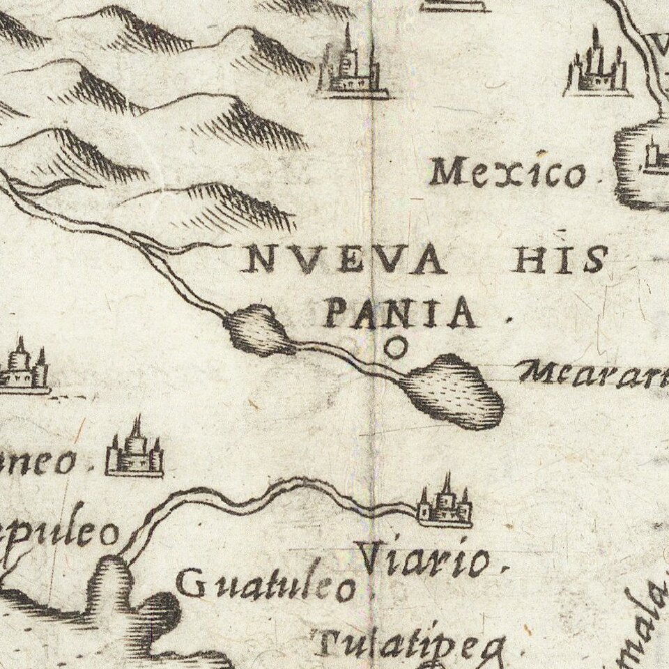 While the map does illustrate some major cities in Mexico—including one labeled “Mexico”, which was formerly the Aztec city of Tenochtitlan—it does not acknowledge the presence of indigenous peoples who predated Spanish settlement.