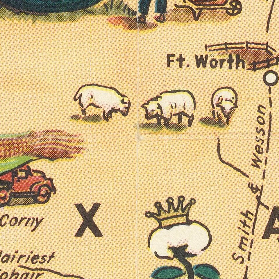 Decorative details of native flora and fauna, people, sites, etc. are throughout the map and borders. They include a tornado (called "interpanhandle wheat harverster"), a rattlesnake ("orneriest rattlesnakes"), and a rodeo cowboy ("the man that couldn't be throw'd and the horse that couldn't be rode."). The Alamo and San Jacinto Monument are among the border illustrations.
