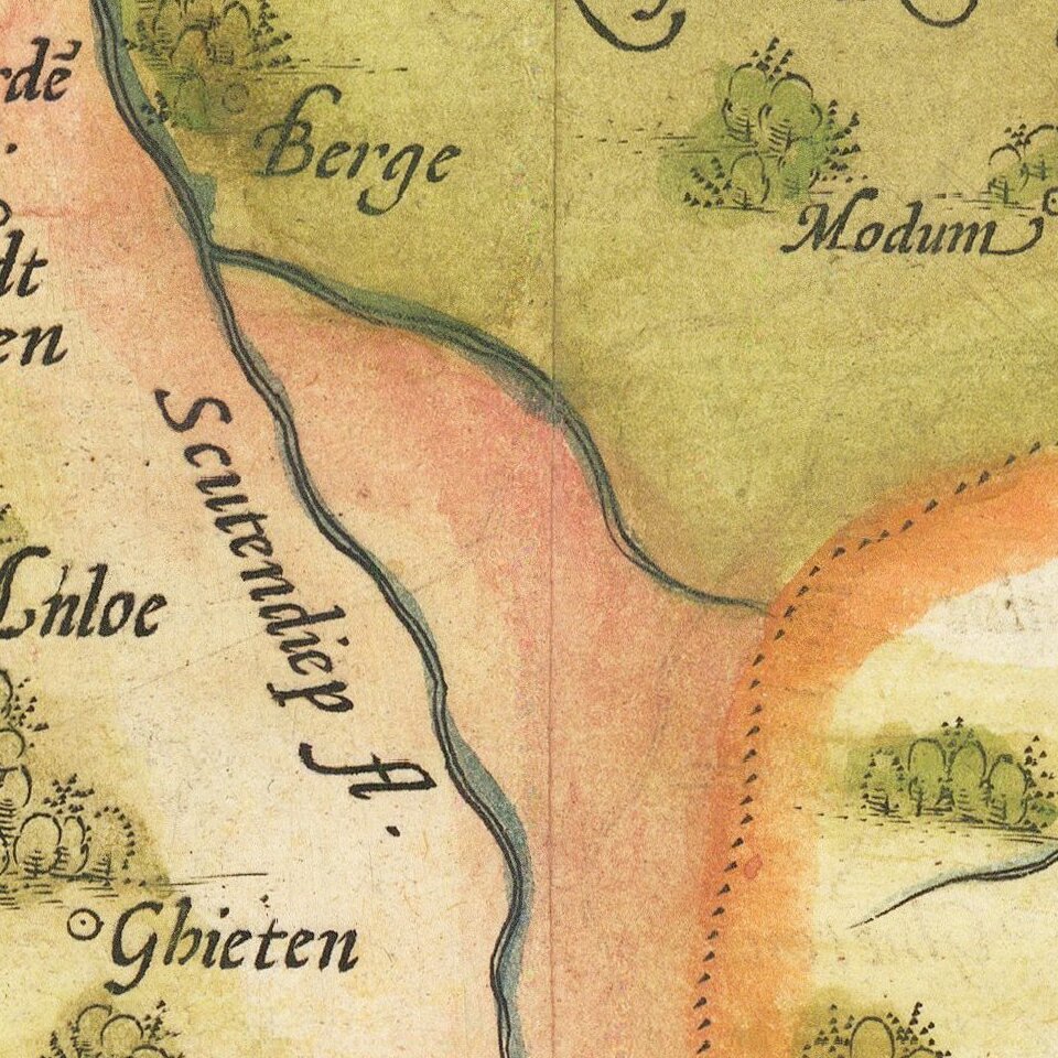 A nice old color example of Ortelius' map of Friesland, including a larger compass rose, sailing ships and an elaborate cartouche.