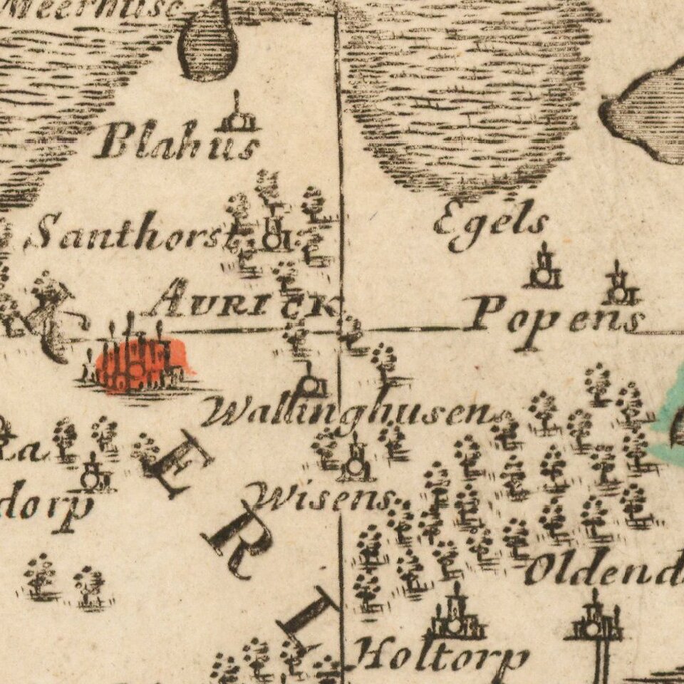 Shows major regions and towns such as Oldenburg, Osrtringen, Auricherland, Fredeburg, etc along with roads, farm lands and waterways.