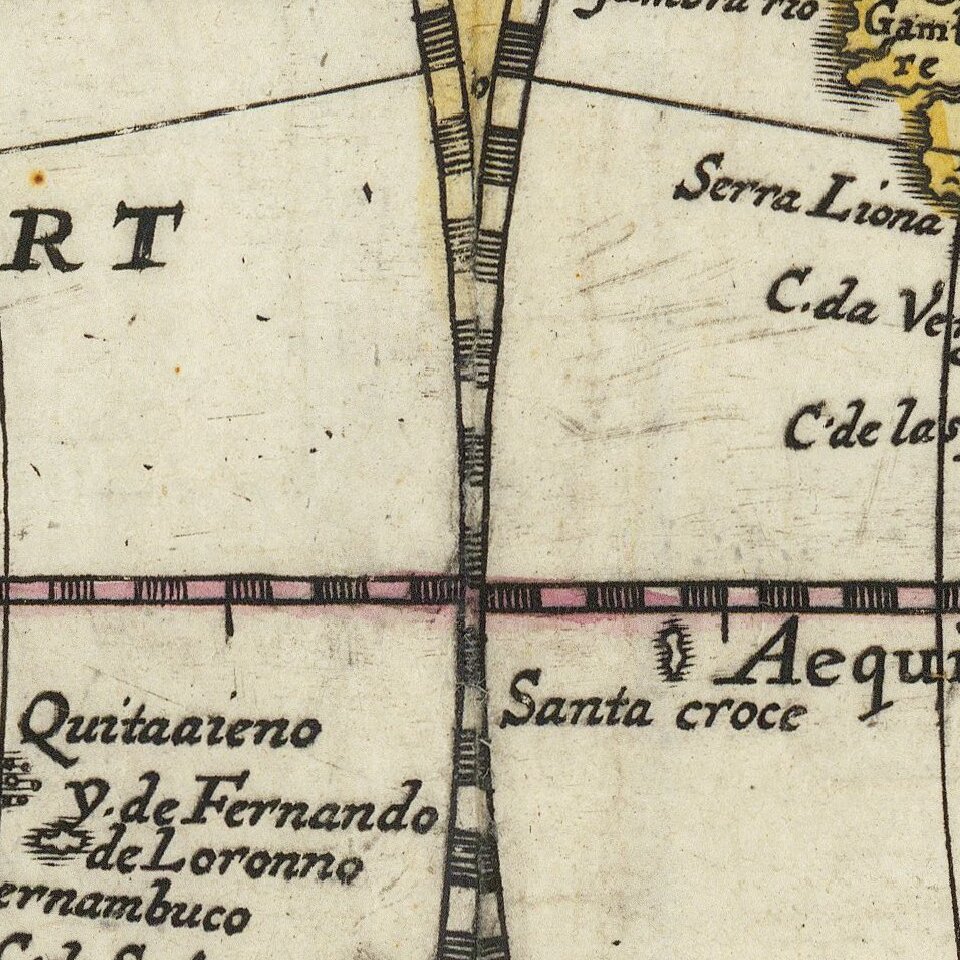 The cartographical features follow Jan van Doetecum’s world map engraved for Merula’s Cosmographiae universalis (1605;), with changes in the southern hemisphere of the globe according to more recent discoveries; whereas the decorative elements surrounding the two hemispheres is copied from Visscher’s world map from around 1663.