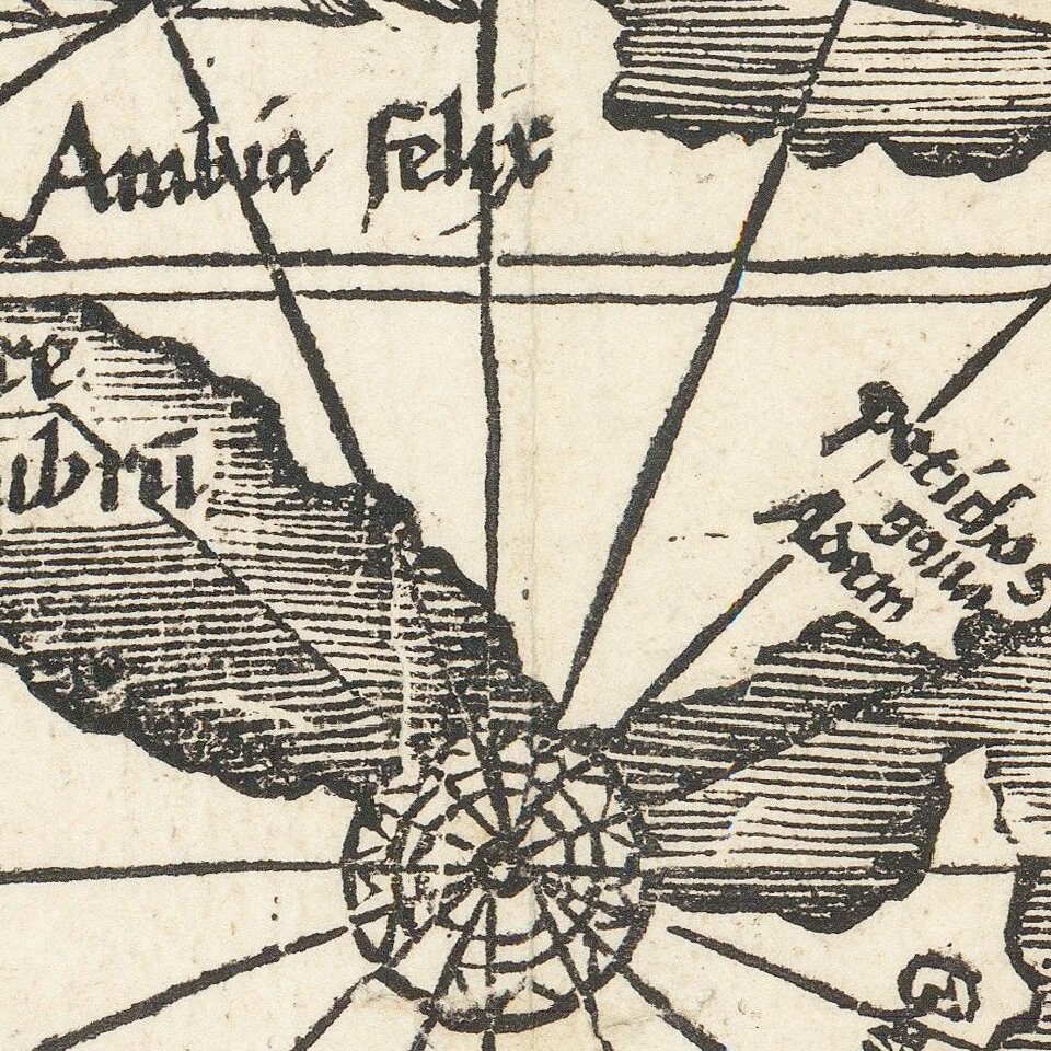 According to Burden, Waldseemüller likely began work on this map in ca. 1505, when he was a professor of cosmography in St.-Dié. Waldseemüller worked on the Ptolemy with Matthias Ringmann, who collated the texts, while Waldseemüller compiled the maps. However, when their patron René II died in 1508, the St.-Dié Press closed down. Ringmann died in 1511. These events stalled the project and it was only in 1513 that the Ptolemy appeared, printed by Waldseemüller’s friend Johann Schott.