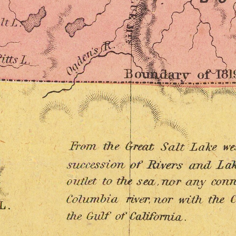 The region between Mud Lake and Salt Lake City are similarly uncharted by Fremont. The tributaries of the Upper Colorado River are substantially incomplete, lacking the White River, Red River etc. The Gila River is shown with its terminus in the Gulf of Mexico and with a radically incorrect course and apocryphal tributaries. There is an apocryphal Sevier River along Rio Colorado. The border with Mexico is also substantially south of its true course.