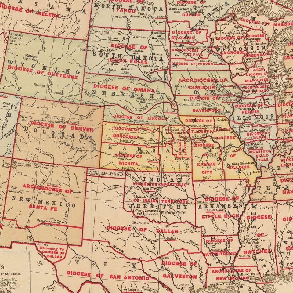 While we note later maps of the US showing the Catholic Provinces and Dioceses of the same title (M.H. Wiltzius & Co., 1899), the present map is extremely rare. We note only the example at Benedictine College in Kansas.