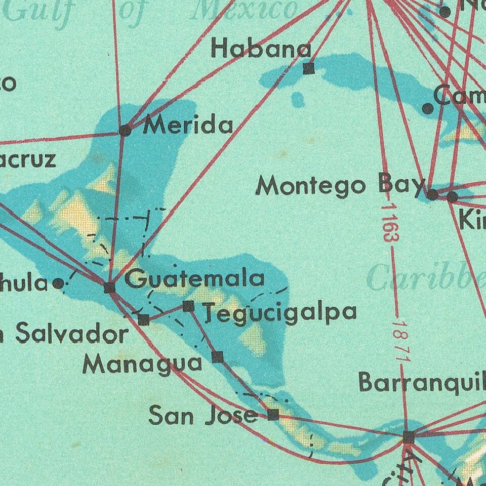 Shows all the routes around the world to which Pan Am flew in 1963, including connecting lines and Pan Am's own lines.