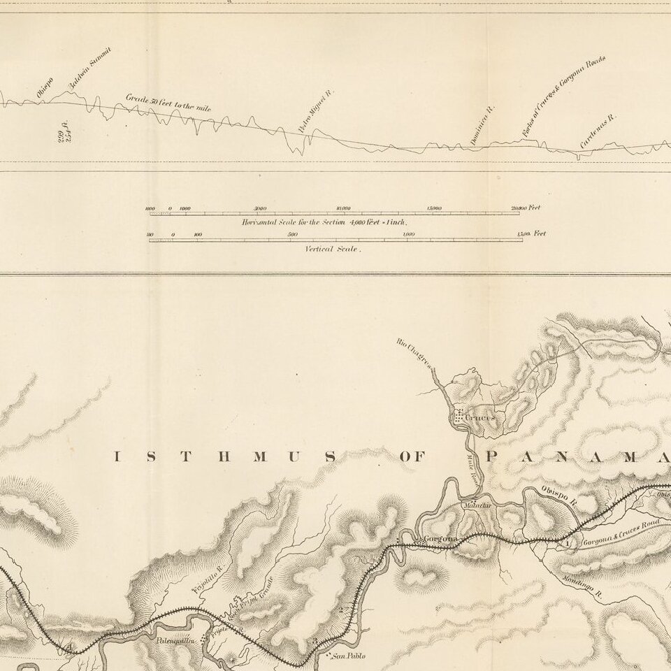 Detailed map of the proposed route of the Panama Railroad, from Manzanilla Island to Panama City, as surveyed by G.W. Hughes in 1849.