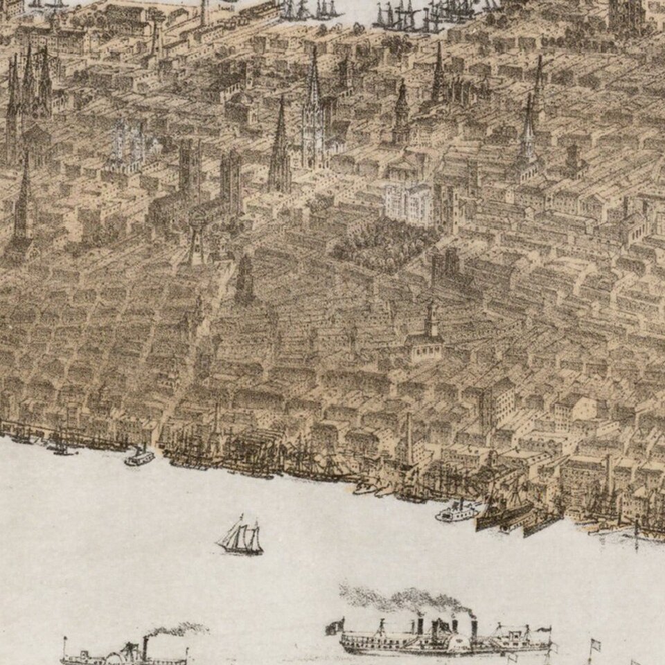 Bornet's fine view features Manhattan and a sweeping view from the West, with New Jersey in the foreground, Manhattan in the Center and Brooklyn, Westchester County, Long Island and Staten Island in the distance.