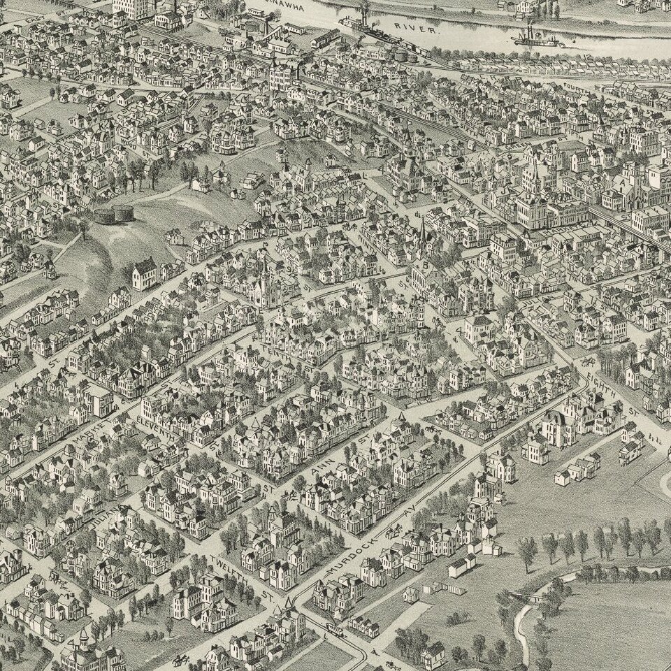 A stiking and highly detailed view, showing street names, buildings and the river. A classic late 19th Century view.