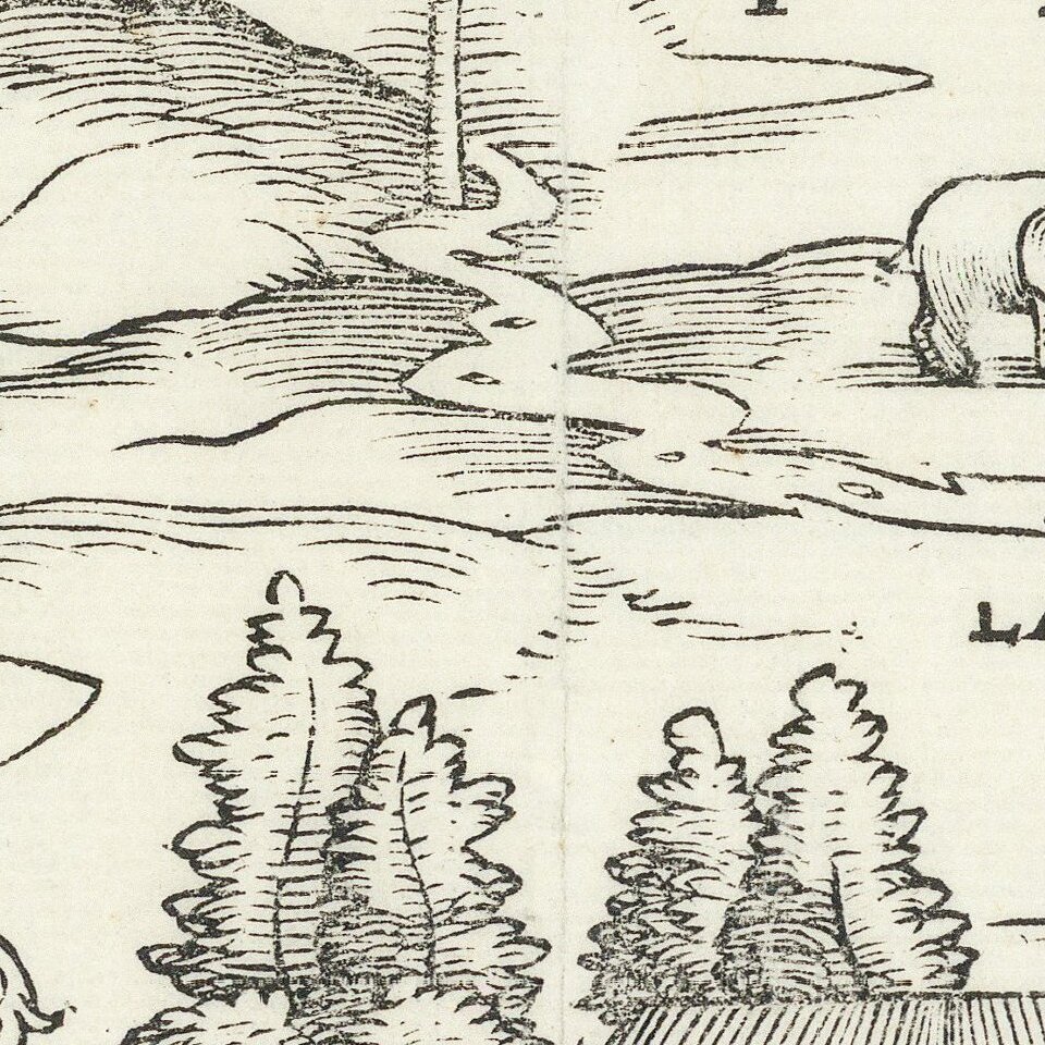 This map is known in two states. One appeared in volume three of Ramusio’s travel collection, first published in 1556. The second state, of the 1606 edition, is recognizable by evidence of woodworm damage to the printing block and the pagination numbers “370” and “371.”