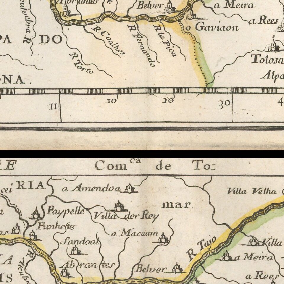Nicolas Sanson's 1654 double-page engraved maps of northern and southern Portugal, with a large sailing vessel in the upper left corner.