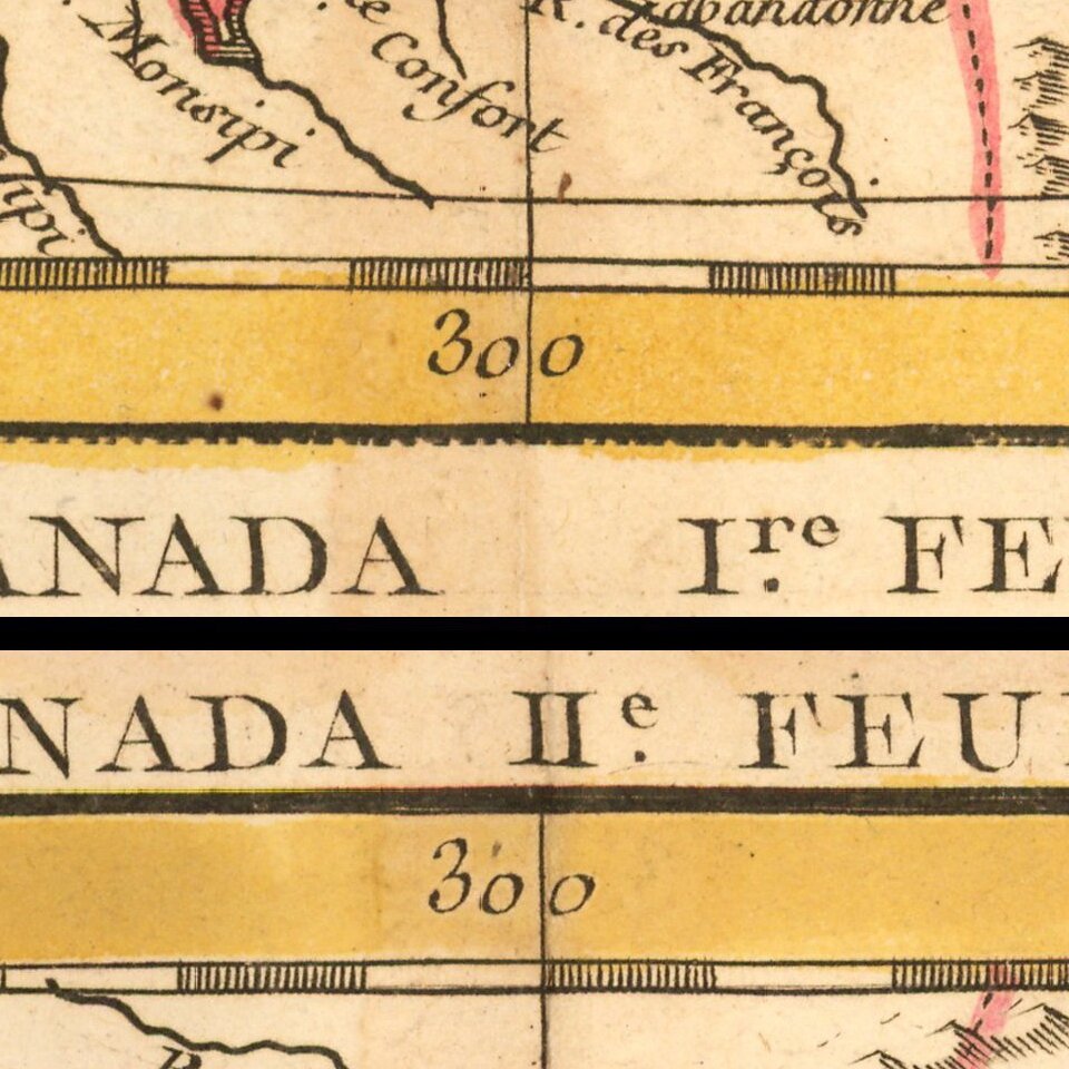 The various lines denote the boundaries of Canada, Mexique (New Spain), the lands of the Hudson's Bay Company and Louisiana. Curiously, no line is shown differentiating Canada from the remaining British Colonies. The boundaries of the British Colonies and East and West Florida are not shown.
