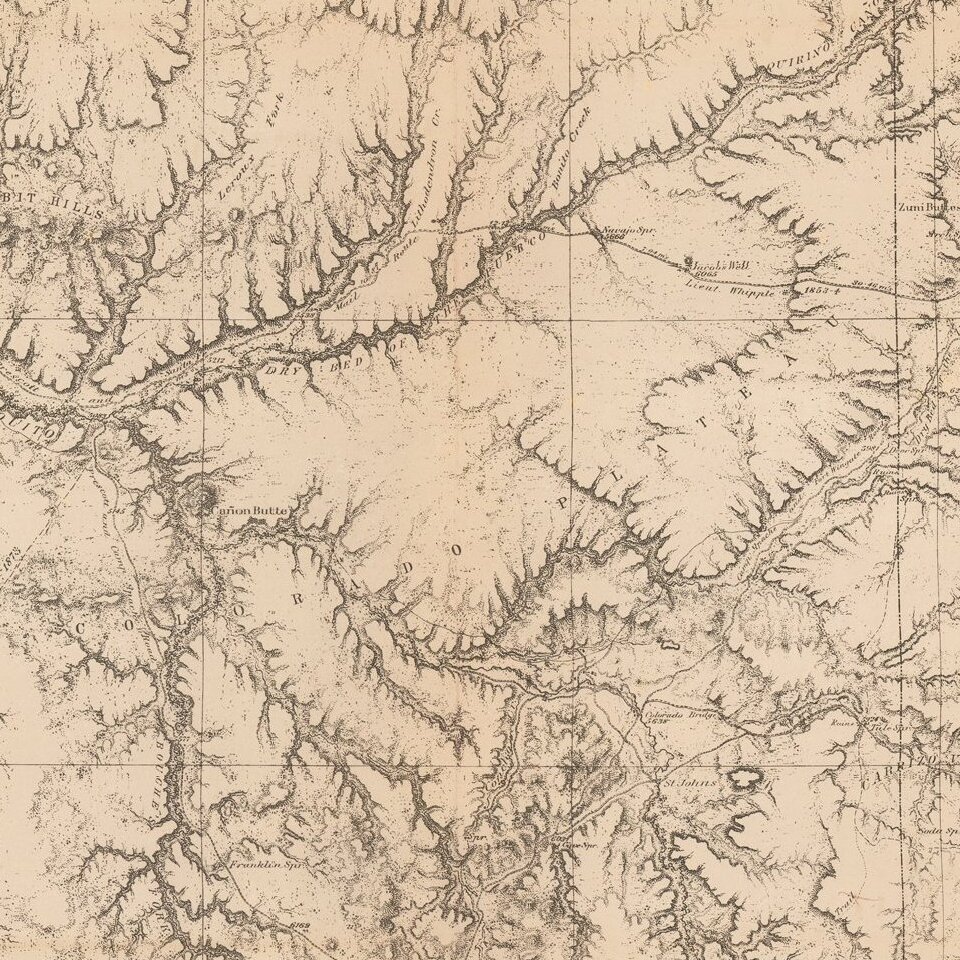 Shows towns, roads, mountains, rivers, lakes, hydrographical details, etc., and the Prescott and Santa Fe Mail Route, Albuquerque and Zuni Road, Routes of Lieutenant Parke, Lieutenant Whipple, Lieutenant Russell Ives.