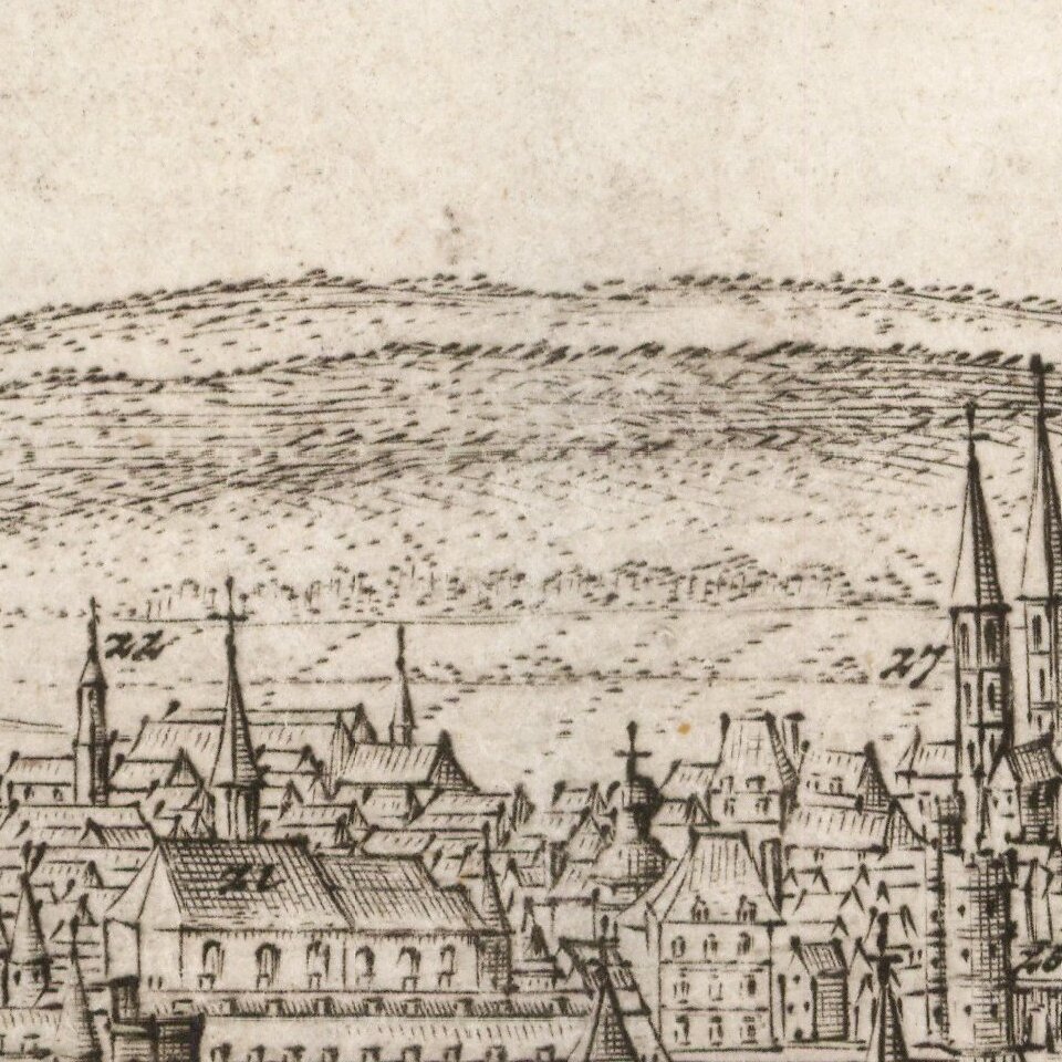 With poem on the beauty of the town in Latin, Dutch and French by A. Montanus. With legend of main churches, monasteries and buildings.