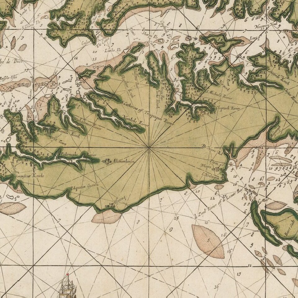 Van Keulen was one of the first chart makers to incorporate Augustine Hermann's landmark mapping of the Chesapeake in 1673 (known in only 3 surviving examples), even utilizing Hermann's symbols for the plantations along the Bay and various rivers. An early example of the Dutch reliance on English maps as source material, a trend which would increase with time, although ironically the commercial success of the Dutch Sea Atlases would in turn compel the English chart publishers to recycle the Dutch material in English Sea Atlases of the period. Van Keulen's map would also become the model for other Dutch charts of the period by Robyn and Lootsman.