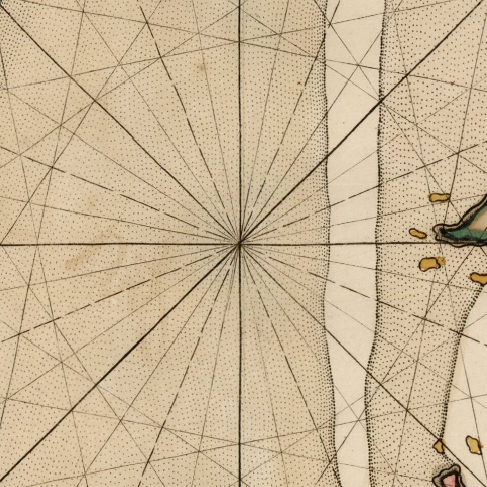 Oriented with West at the top, Van Keulen's chart provides a highly detailed treatment of South Florida, from the Mosquito Lagoon and the Merritt Island area in the north to Tavernier and Islamorada in the south. Six or Seven Keys are named, including Key Biscayne, which is called Cayo de Biscambos. Cajo de Melchior Roiz appears, drawn from Hessel Gerritsz' chart of 1631.