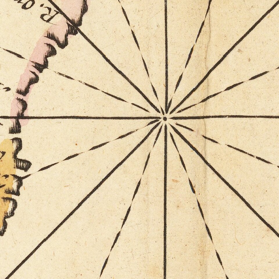 The east-oriented chart follows the coastline closely, stopping south of La Serena in Chile. It is one of the earliest regional charts of the Pacific Coast of the Americas. This the second state of the map, which includes the Gulf Coast of Central America, unlike the first state. There are three insets nestled into inland North America and what would be the Caribbean, along with the title cartouche. These insets, outlined by delicate floral edges, show islands of interest to Europeans, although they were still seldom frequented by them when this chart was published.