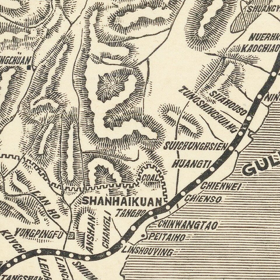 Small map covering northeastern China from Beijing to Shenyang (Mukden), covering the extent of the Peking-Mukden Railway.