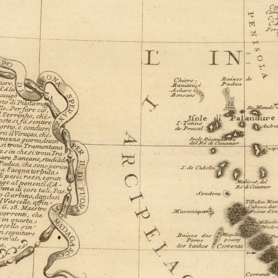 Striking example of a Coronelli Globe Gore Section, extending from the Persian Gulf to the Maldives and the west coast of India.