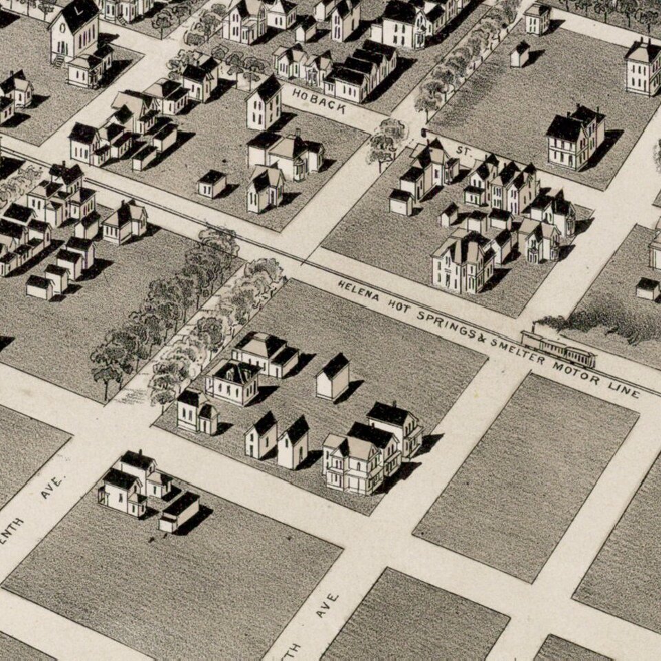 A large two-stone lithographic view of Helena, Montana, with streets named and all the buildings shown in perspective. There are seventeen inset views of outlying subdivisions, and specific buildings including the East Side additions of Lenox and Corbin, the Northern Pacific Railroad repair shops and Round House, the Wallace-Thornburgh Lumber Company, the Helena Daily Journal and other newspapers, the Broadwater Hotel and Natatorium, various banks, manufacturing plants, the residence of W.E. Cox, Nick Kessler's brewery, etc.
