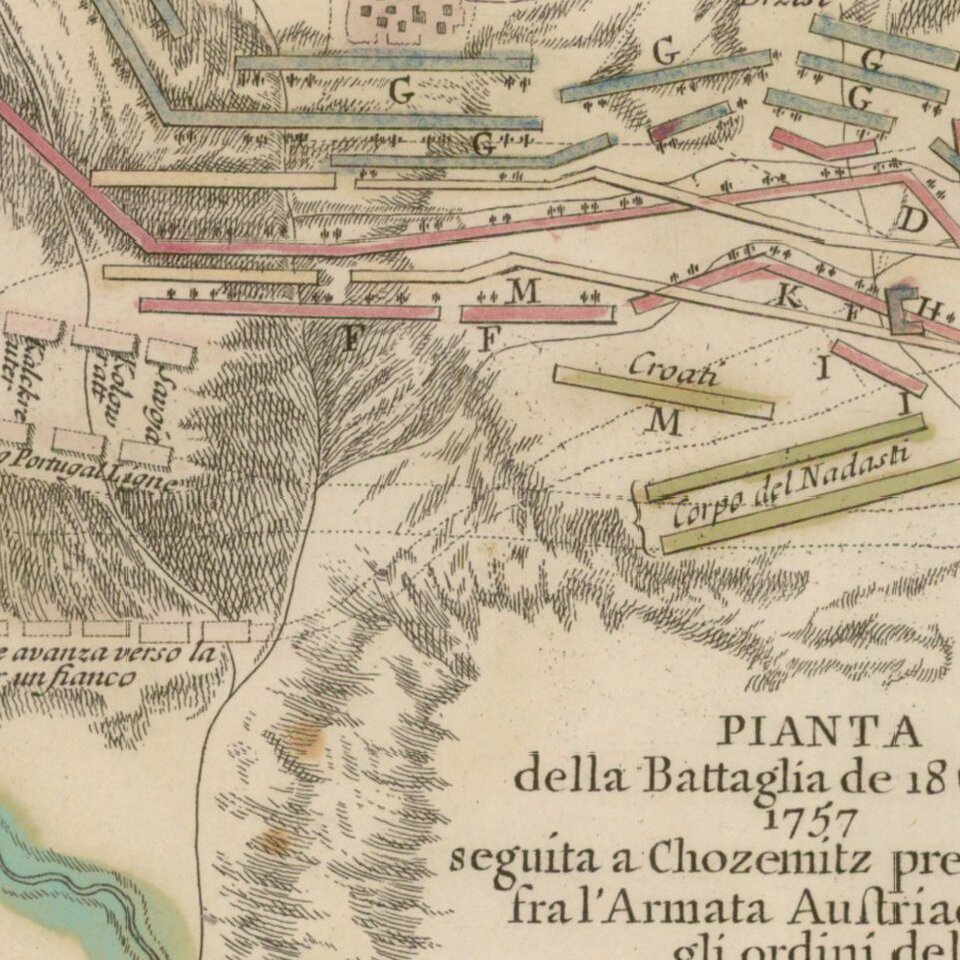 Detailed Italian language battle plan of the Battle of Kolin, fought to the east of Prague on July 18, 1757, during the Seven Years War.