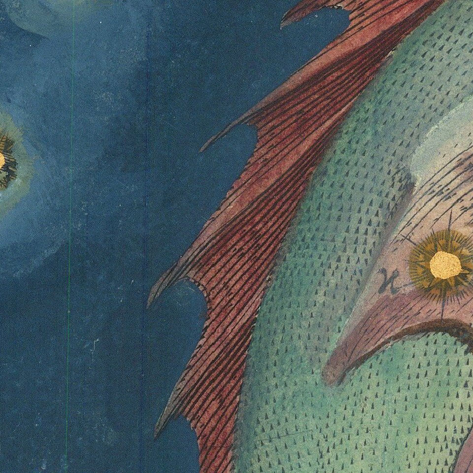 A magnificent full-color example of Bayer's celestial chart of Piscis Austrinus, with the stars heightened in gold. Piscis Austrinus is the being that swallows the water poured by Aquarius and is an important constellation in several ancient civilizations. A recurring tale in Mediterranean cultures tells of the fish saving a heroine, in Egyptian mythology this is Isis. The two fish in Pisces are sometimes taken to be the offspring of this Piscis Austrinus.