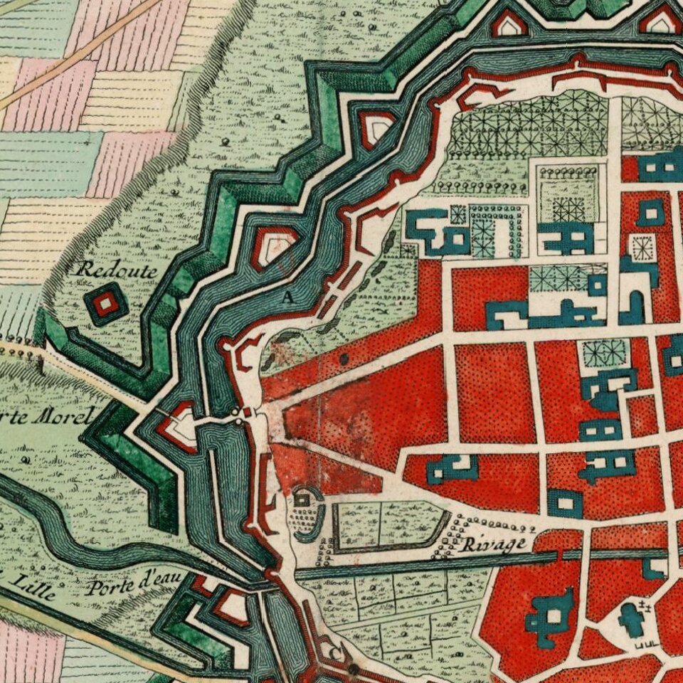 Striking old color example of Covens & Mortier's plan of Douay and the neighboring Fort D'Escape.