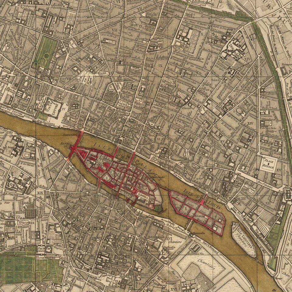 Includes symbols showing the limits of the City at the time of Philippe Auguste, Charles V and Charles VI, and Louis XIII (based upon the map of Gomboust).