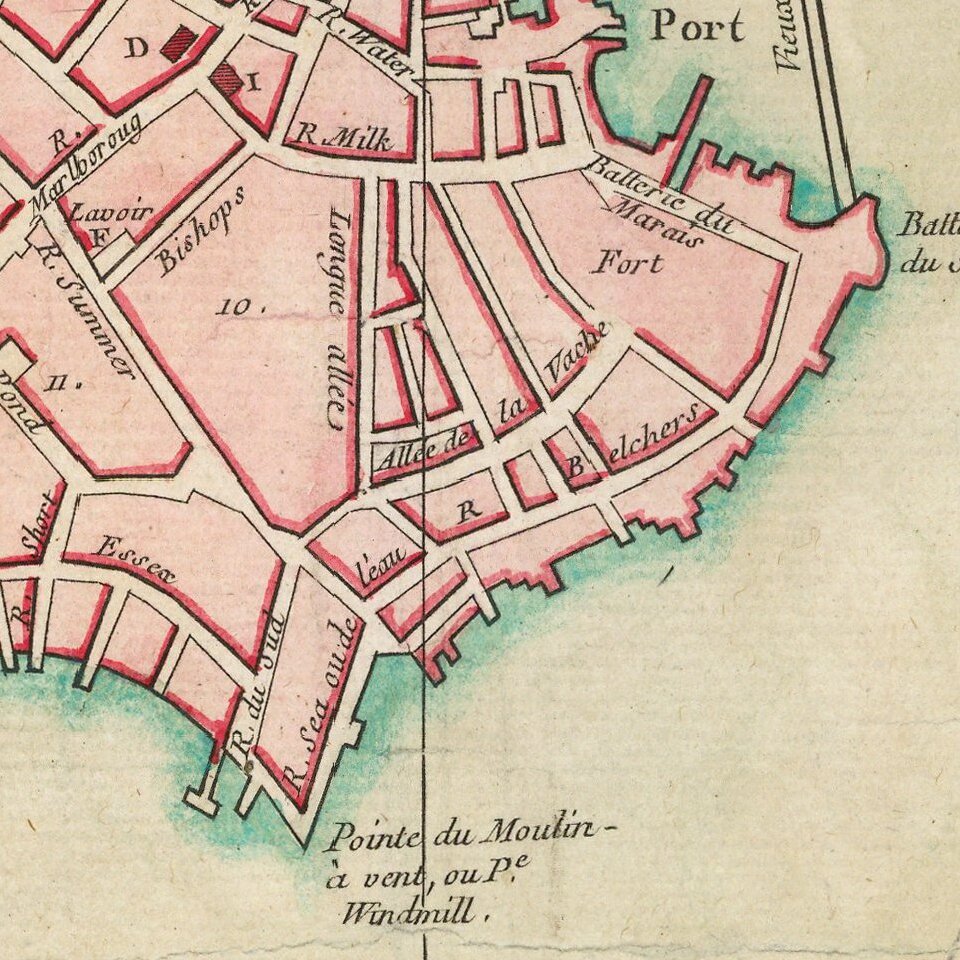 This is the earliest detailed plan of the city of Boston published in France. Beautifully engraved and colored in the best style of French manuscript and printed maps, it shows streets, houses, public buildings, wharves, Beacon Hill, the Common, and other points of interest. Bellin, hydrographer to the King of France, published many fine maps of America under the auspices of the French Marine Office. This plan of Boston Harbor was probably copied from an English survey for use during the French and Indian War. The talent and skill of Jean Lattré, a French publisher and engraver, are displayed in this attractive map of the immediate environs of Boston. The city and harbor command a sparse but forceful appearance in which the clarity of the engraving is complemented by the richness of the full wash color. The city itself is carefully rendered, with each existing street shown, including King Street extending inward from the Long Wharf toward the State House and site of the Boston Massacre. It is particularly useful in illustrating the circumstances of the Massacre and the days that followed, for it includes within the Harbor an inset of the fortified island upon which Castle William stood - the location to which the British regiments retreated according to Hutchinson's report.This is the first state of the map, without the engraved text box in the upper right, and not depicting the road into and fortifications around the Boston Neck and elsewhere.
