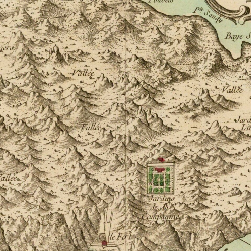 Some corruption of place names has crept in, however, Man and Horse Point has become Pointe Manand. Bellin does add some new touches, indicating the location of the Company Gardens in the interior of the island and giving some information on the strength of fortifications; six cannon at Rupert's Fort and four cannon at what is the Northern or North Point (Sugerloaf Point) of Seller and Moll. Bellin also indicates some water depths in the Roads.