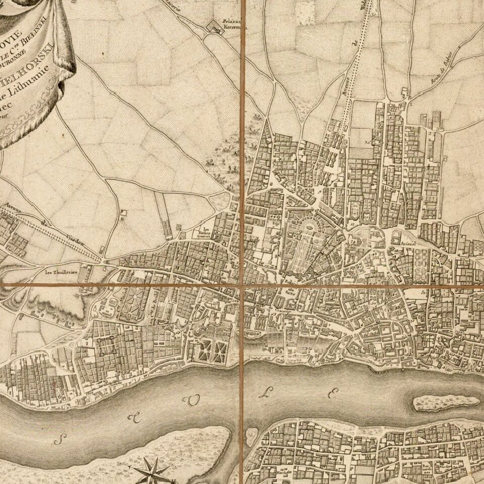 Rizzi Zannoni's plan is based upon the 4-sheet plan of Warsaw by Pierre Ricaud de Tirregaille, entitled Plan de la ville de Varsovie: dedie a S. M. Auguste III Roi de Pologne, Electeur de Saxe etc. etc., levé par ordre de S. E. M. le Comte Bielinski Grand Marechal de la Couronne, first published in 1762.