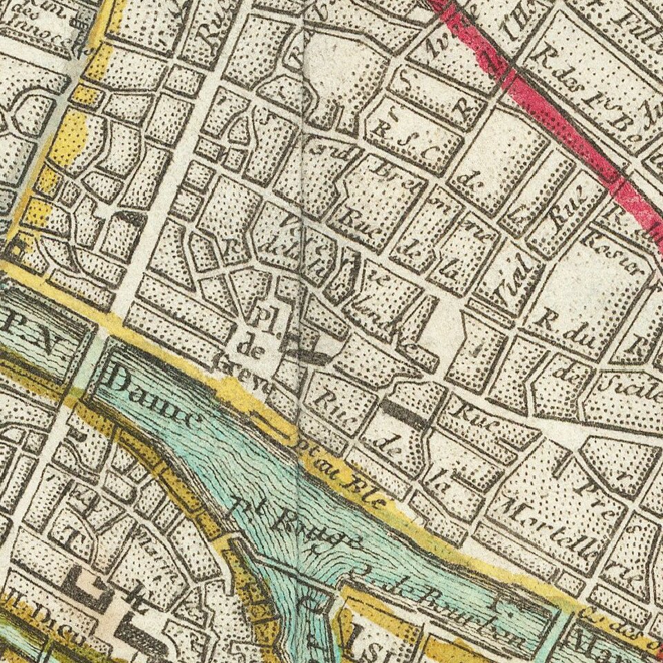 The plan is based on a plan by Moithey published in 1772, and includes the arms of France and the city of Paris and shows the six successive city walls, watercolors at the time.