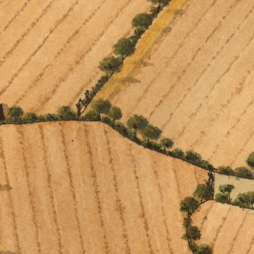 Expertly drawn in great detail with individual trees along hedgerows colored and bearing an eastern shadow, buildings, roads and windmills shown.