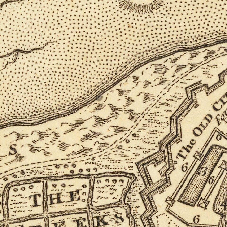 Detailed plan of the city of Dunkirk, including fortifications, town plan, roads, farms, rivers and canals.