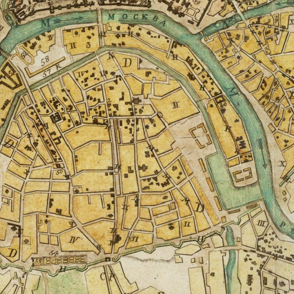 The broad Moscow River drainage canal, which formed an island immediately to the south of the city center is shown, and although underway, the project had not yet been completed. Many of the large stone buildings shown in the center of town, such as in Kitay Gorod, had not yet been built. All this being said, much of the overall plan depicted by Marchenkov was eventually constructed, more of less as shown, making this the first truly modern map of Moscow.