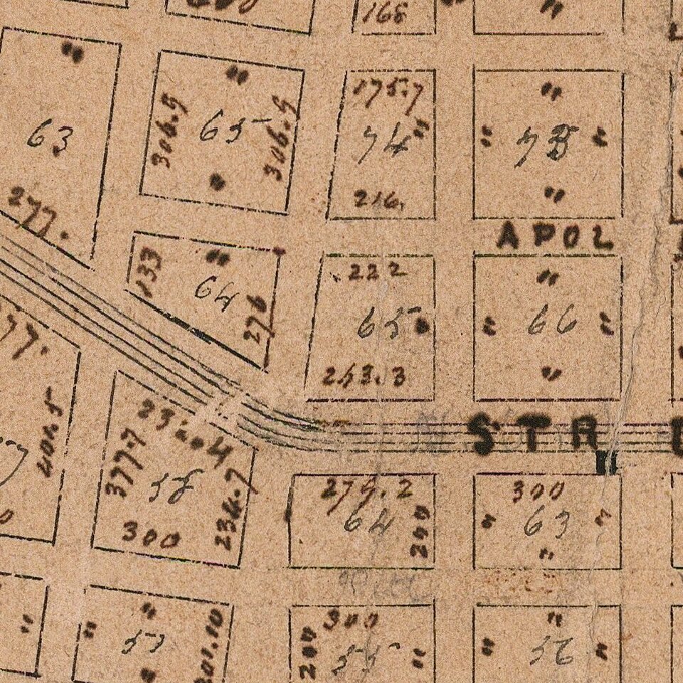 Jefferson is shown centered on the intersection of two broad avenues, Napoleon and Nayades, along the latter of which runs the route of the New Orleans & Carrollton Railroad. The irregular orientation is due to its being an “amalgam” of several privately-owned plantations, each laid out in the French manner as a long strip with narrow frontage on the river. In the case of Jefferson, however, an oxbow in the Mississippi River forced each parcel to narrow to a wedge as it ran inland. The plantations were subdivided at different times for development between 1834 and 1855 as faubourgs (suburbs) of New Orleans, each with its own more-or-less rectilinear street plan, resulting in irregular trapezoidal lots along the faubourg boundaries.
