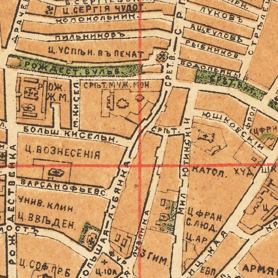 Roads and parks are illustrated in great detail. Important buildings are named in Russian.