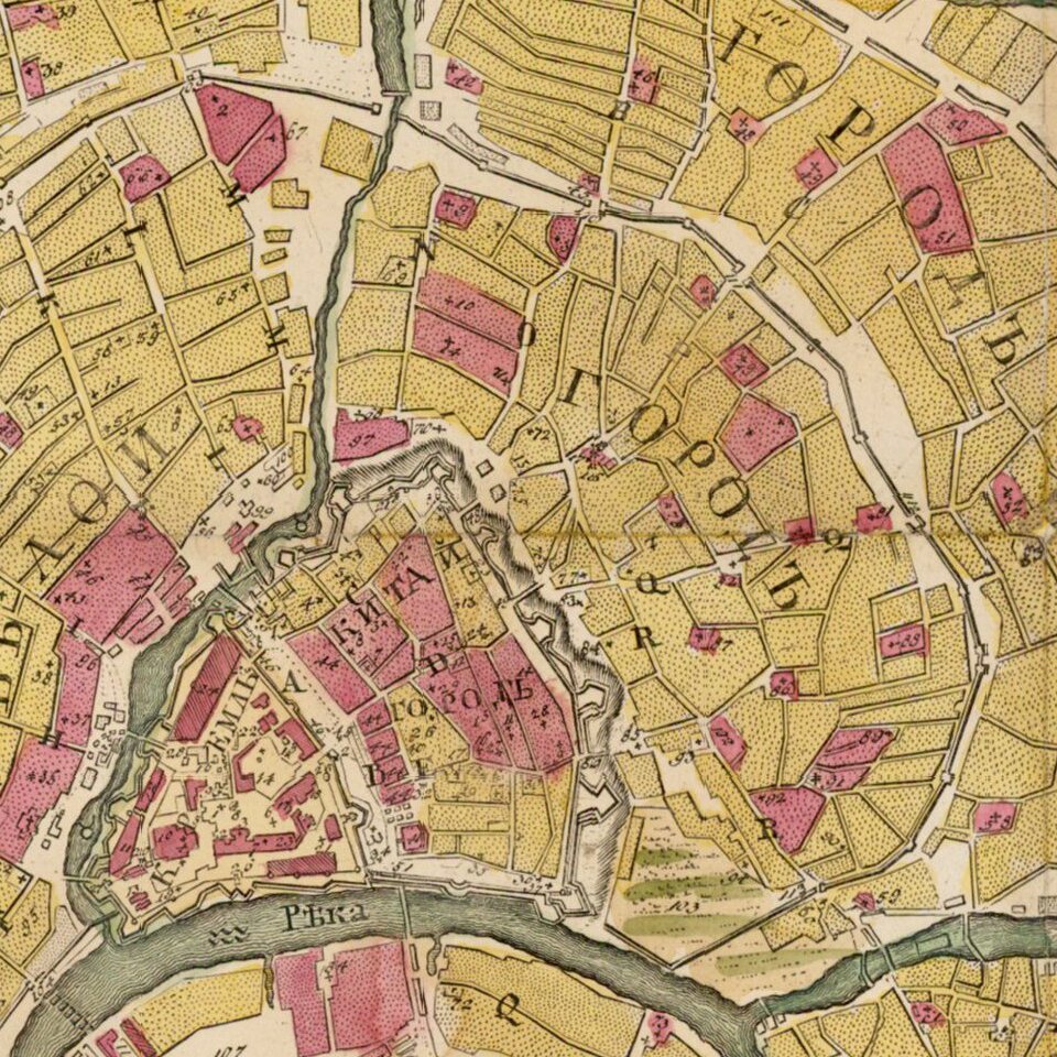 The Plan of 1739 offered an entirely new perspective for transforming Moscow and its suburbs as far as the Kompeneiskii Wall. Based on a geodesic survey and thereby exhibiting the actual topography of the city, the plan showed streets, alleys, blocks, fortress walls and towers, chruches, large estates, groves and fields. Although small in scale, the plan served as a basis for regulating streets, issuing permits and approving plans for new construction until 1775.