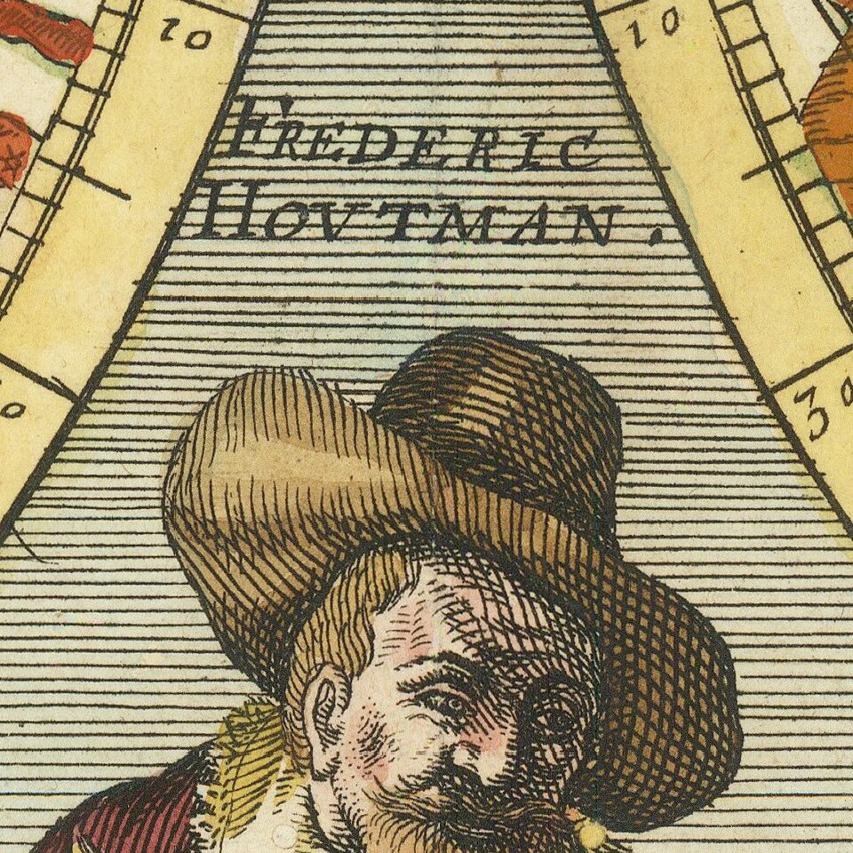 At the top center is an explanation that the the northern sky is mapped based on the observations of Danish astronomer Tycho Brahe, while the southern sky is based upon the observations of Dutch explorer Frederic Houtman, who is best known for his voyage through the Indian Ocean to the Spice Islands, opening up a new route which would lead to the rise of the Dutch East India as a world trading power.