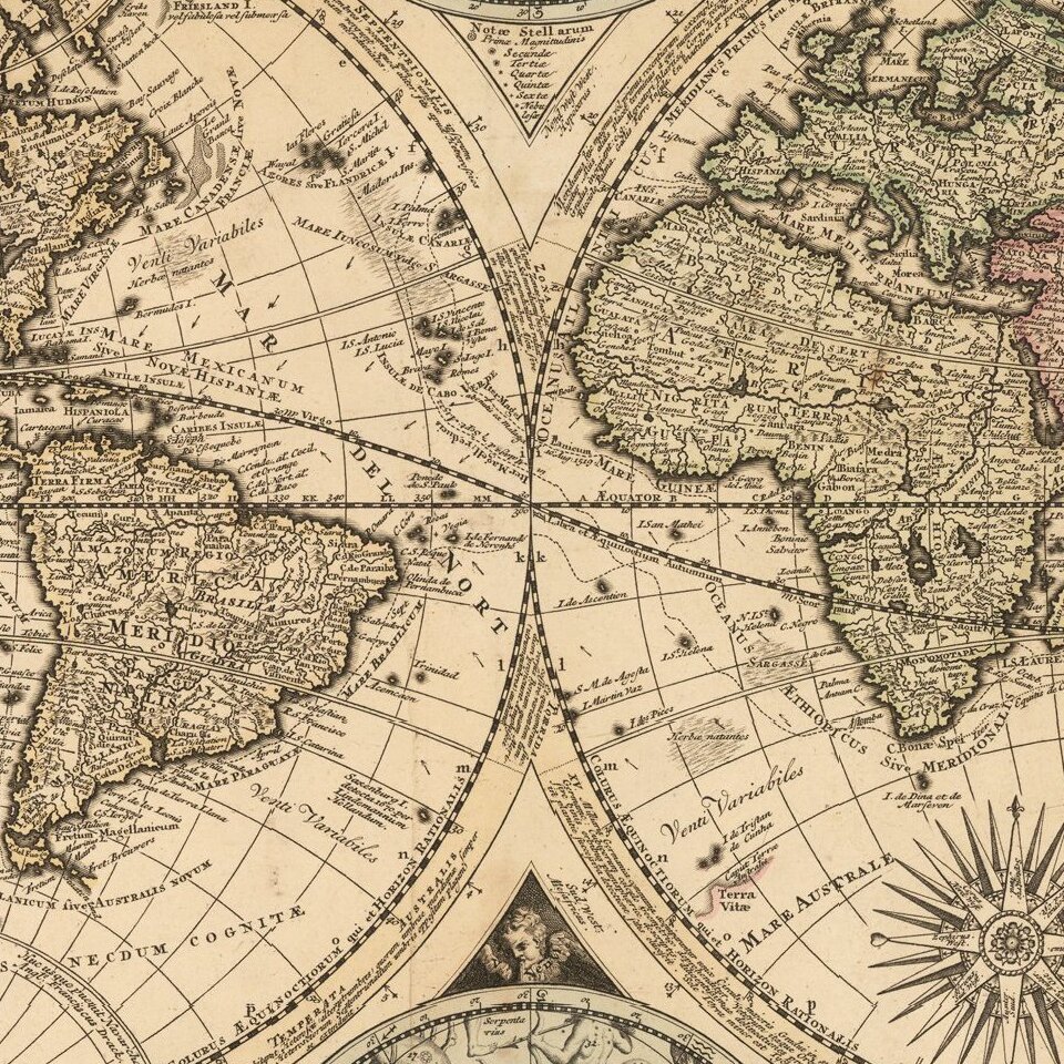 The 32-point compass rose, located at the bottom of the eastern hemisphere, notes eight main cardinal directions named in the classical tradition after the ancient Greek gods of the winds. The Latin names for these classical compass winds are accompanied by their modern Dutch terms (Septentrio: Nord, Zephirus: West, etc.). Surrounding the map are wind directions as well as brief notes on climate zones dictated by degrees latitude, such as “Zona Frigida” near the poles.
