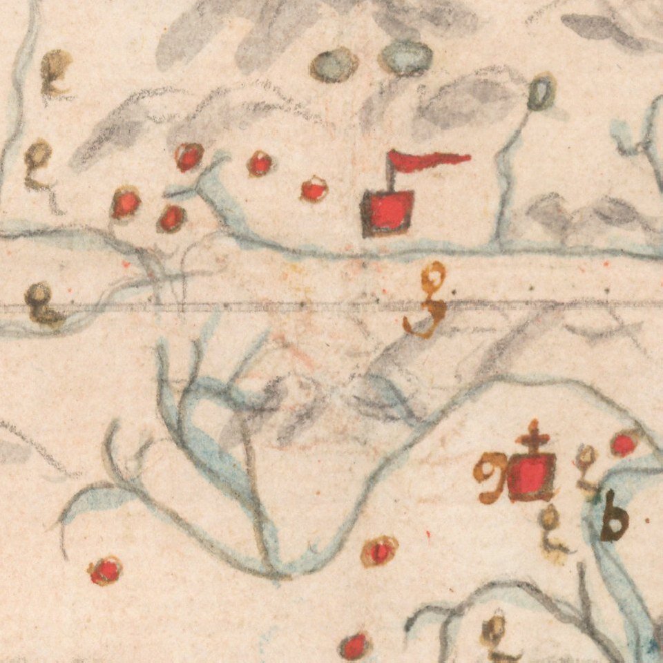 The map highlights the mountainous nature of the geography, as well as shows the abundance of rivers. It has finely drawn details, including a title in a trump l’oeil scroll, delicate calligraphy, and a castle as a north indicator.