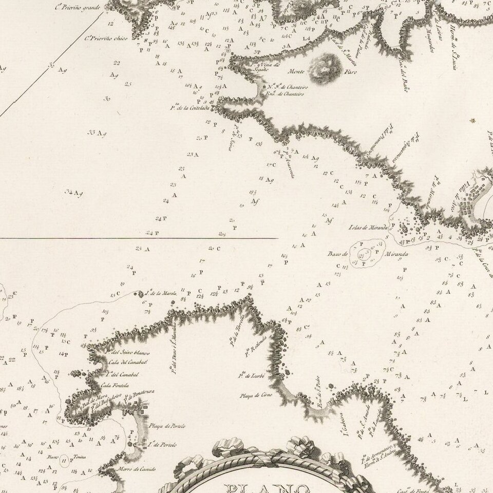 Detailed sea chart of a part of Galicia, showing the harbors at the mouths of the Rivers Ferrol, Coruña and Betanzos, published for the Spanish Hydrographical Society in 1787.