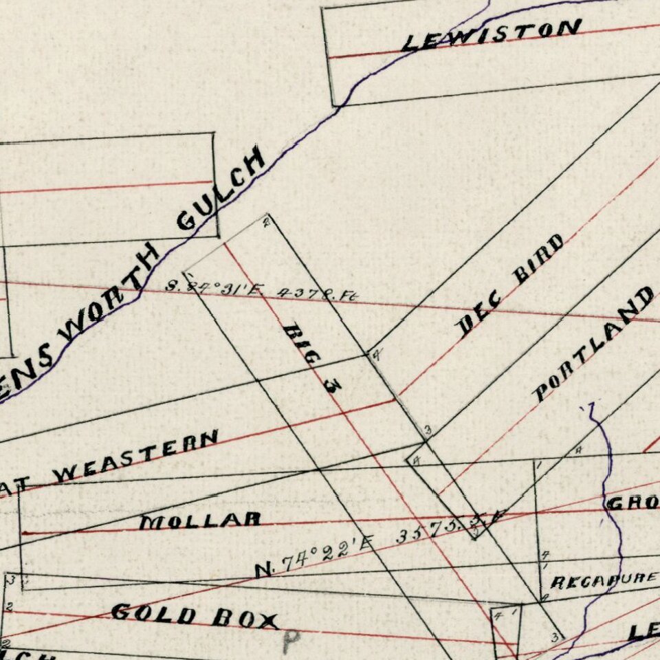 Hand drawn map of mining claims in the Oro Fino Mining District, in La Plata County, Colorado.