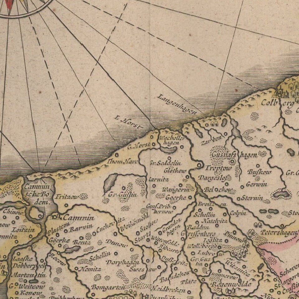 Decorative map of the area of Pomerania, in present day eastern Germany and Poland with considerable detail.