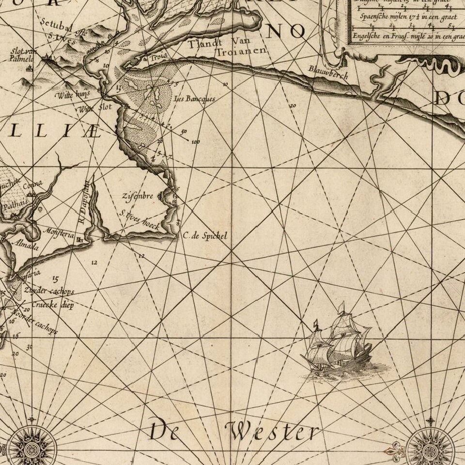 Finely engraved sea chart of the Portuguese coastline, centered on Lisbon, which appeared in Johannes Janssonius's Het Licht der Zeevaert or Le Flambeau de la Navigation, first published in 1620.