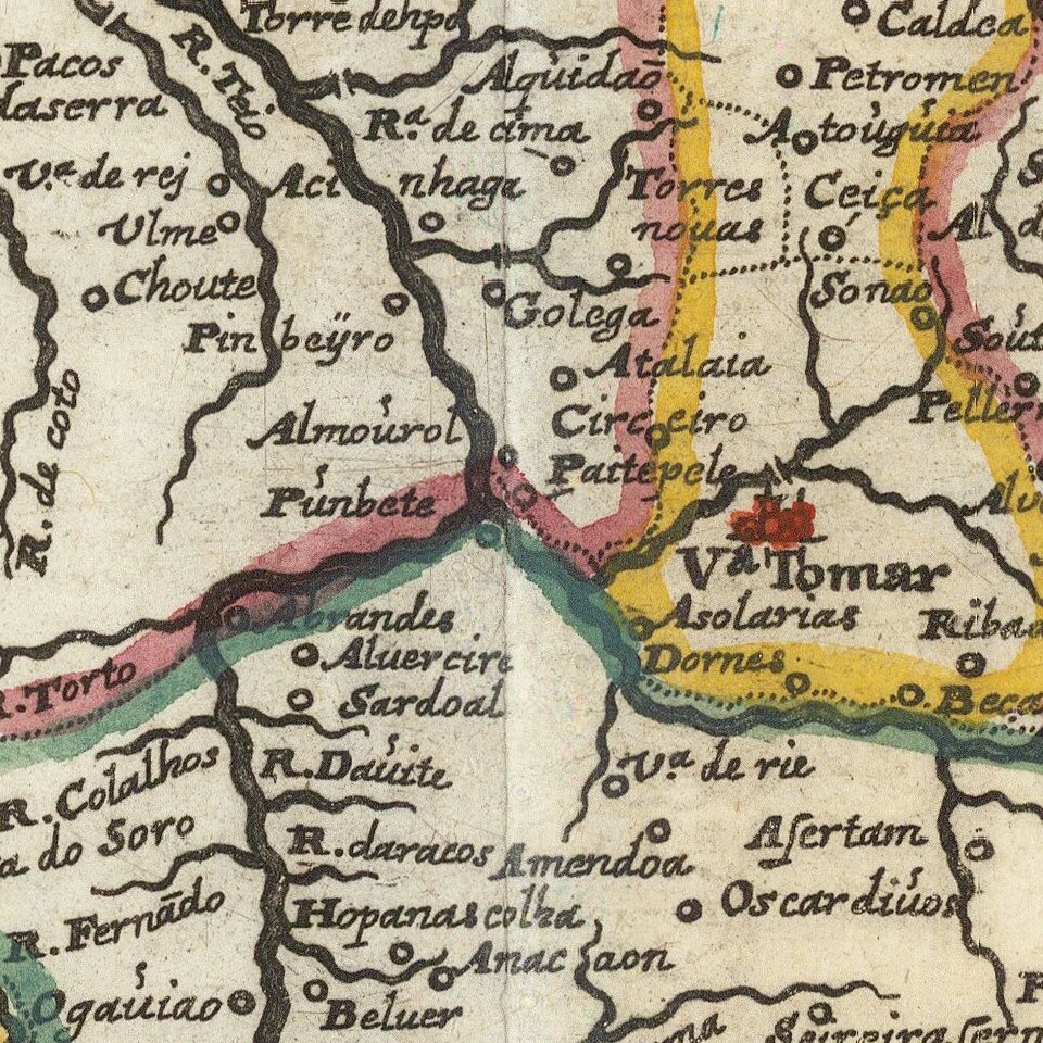 Decorative map of Portugal, based upon an earlier map by Willem Blaeu.