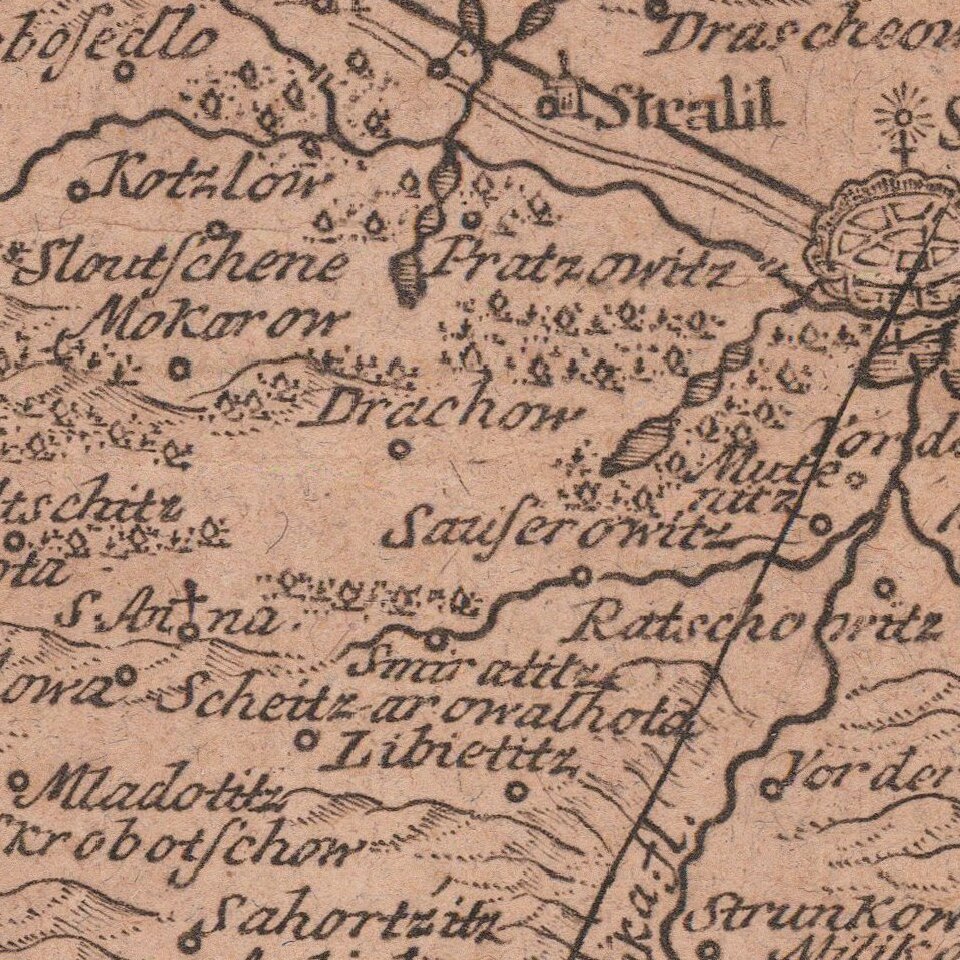 Franz's maps of the 16 Czech regions along with Chebsk were probably published around 1802. They were based on Müller's map of Bohemia. The names of the engravers are listed on some maps with Johann Christoph Berndt (1707-1798) the primary engraver.