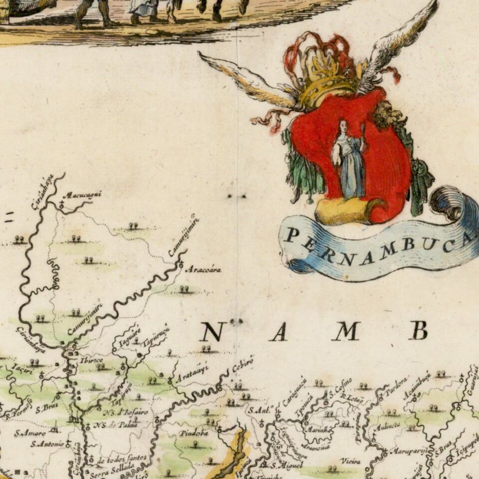 Blaeu first issued this and its companion maps in 1647 for Gaspar Barleus' Rerum per octennium in Brasilia. They were also assembled into a large wall map, Brasilia qua parte paret Belgis; the places where the sheets overlapped are marked by faint lines at left. The maps then appeared in the Atlas Maior beginning in 1662.